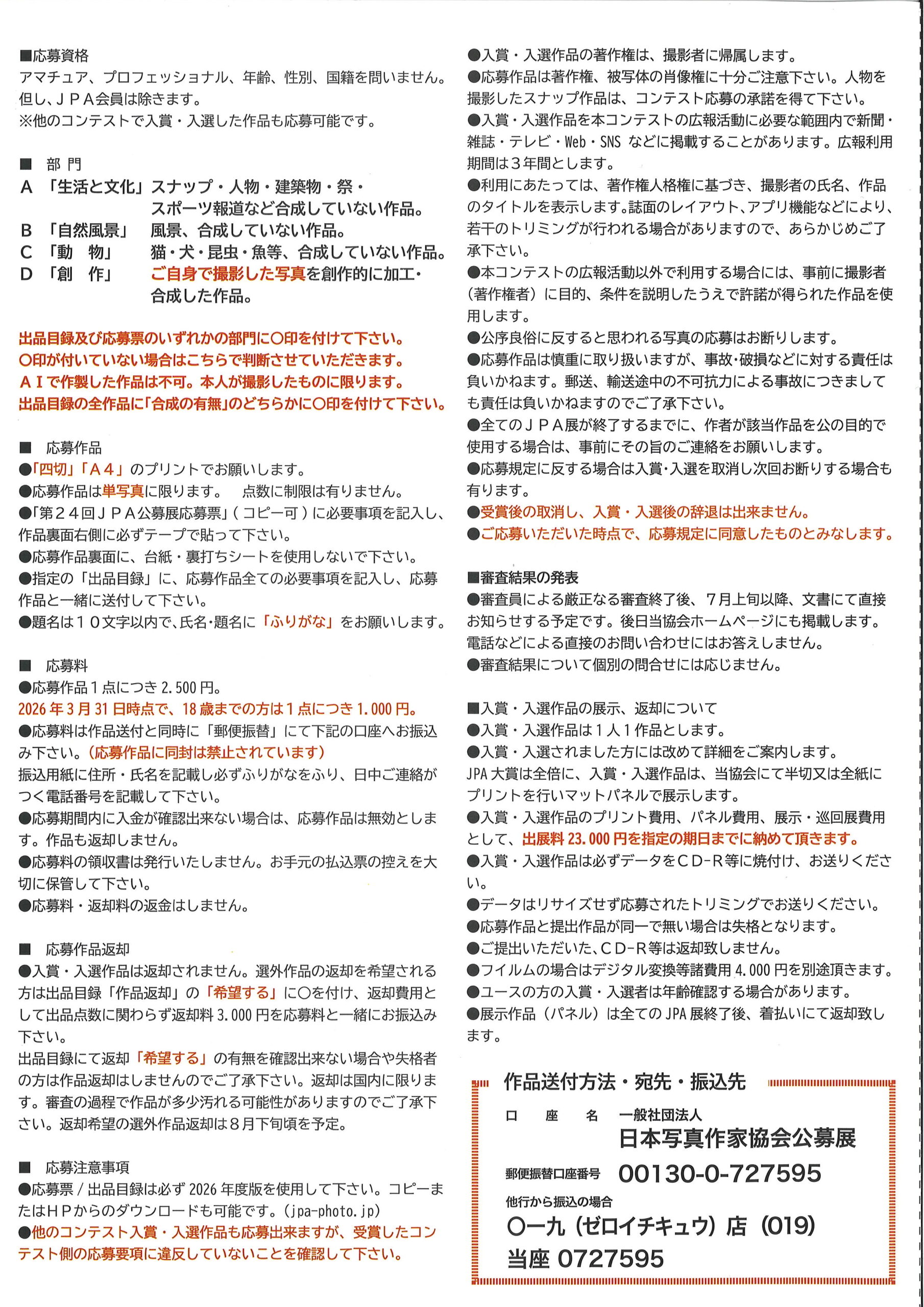 • 入賞・入選作品のプリント費用、パネル費用、展示・巡回展費用として、出展料 23,000円を指定の期日までに納めて頂きます。