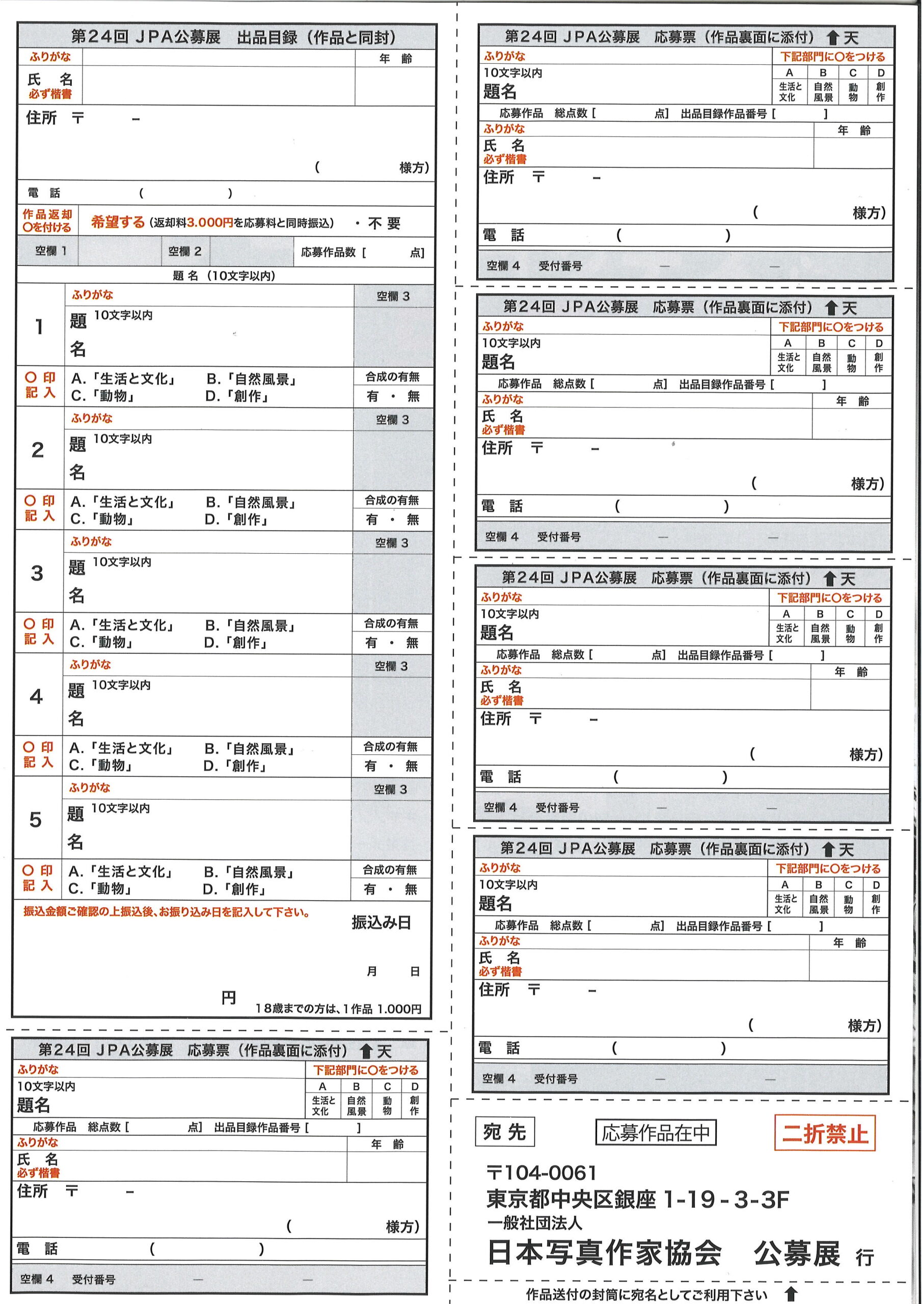 • 「第24回JPA公募展応募票」(コピー可)に必要事項を記入し、作品裏面右側に必ずテープで貼って下さい。